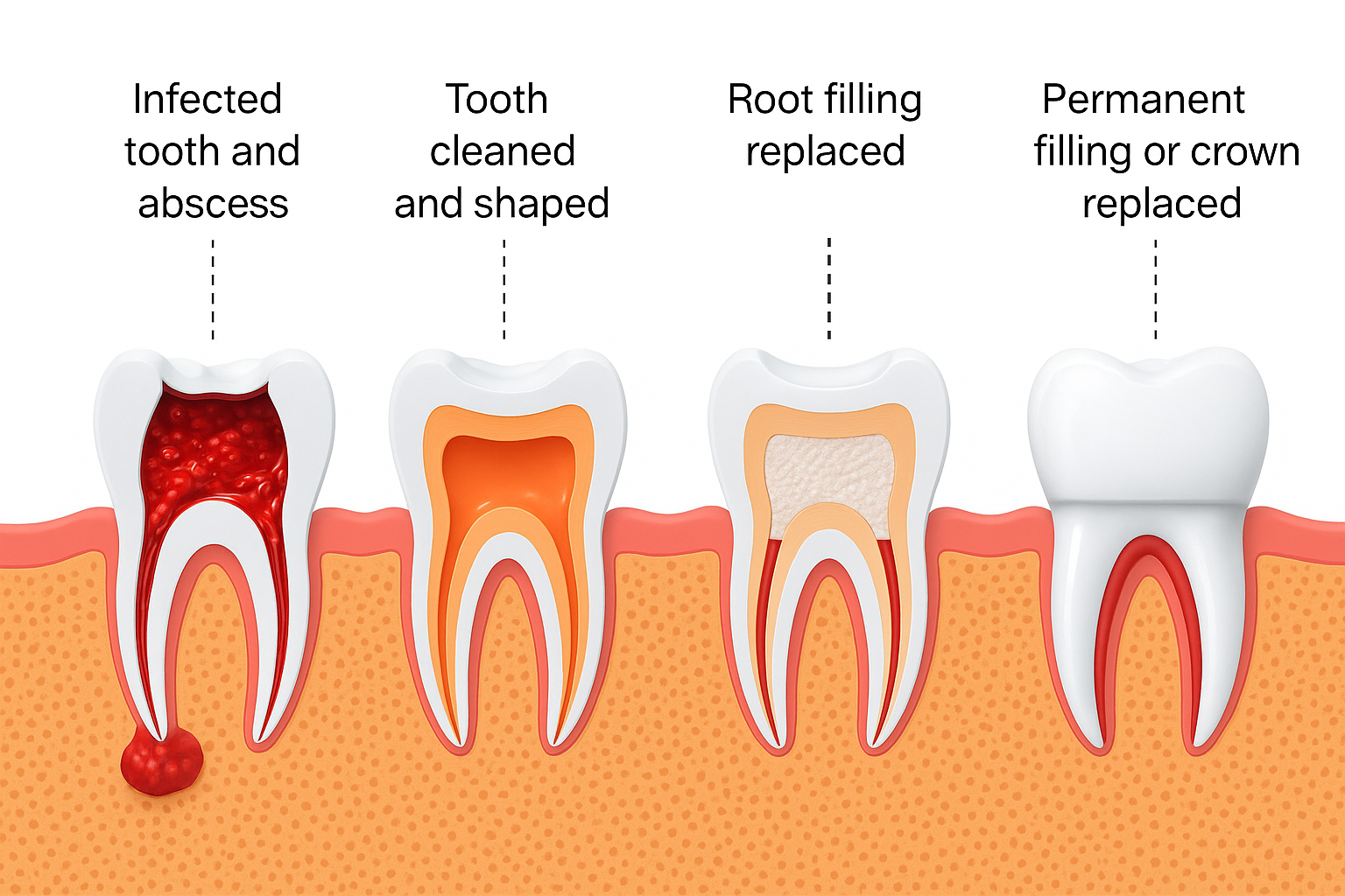 Seal & protect – Canals are filled and sealed; a temporary or definitive restoration is placed depending on your case.
